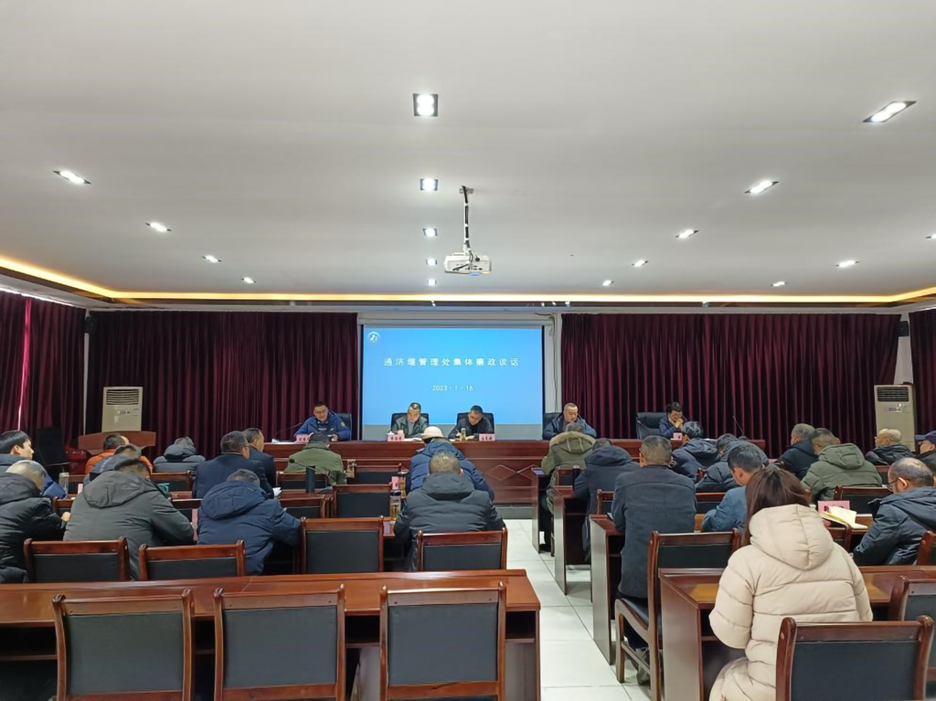 为持续做好正风肃纪,进一步巩固拓展落实中央八项规定精神成果,驰而不息纠“四风”树新风,营造风清气正的节日氛围,中共都江堰水利发展中心纪律检查委员会纪检监督四室分别于1月13日和1月16日在黑龙滩管理处、通济堰管理处开展节前集体廉政谈话。两个处的领导班子成员、中层以上干部参加会议。