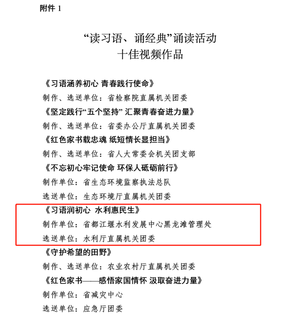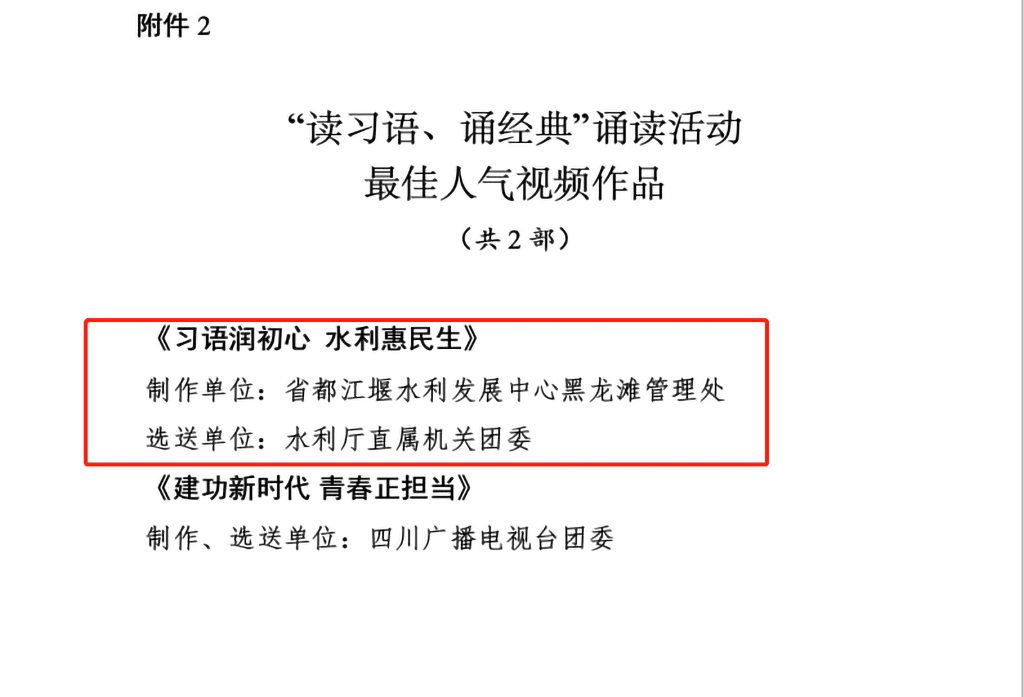 通过各级推报、专家评审、集中评议等步骤,经共青团四川省直机关工委研究决定,由四川省都江堰水利发展中心黑龙滩管理处制作、水利厅直属机关团委选送的《习语润初心 水利惠民生》荣获“读习语、诵经典”诵读活动十佳视频作品及最佳人气视频作品两项奖项。