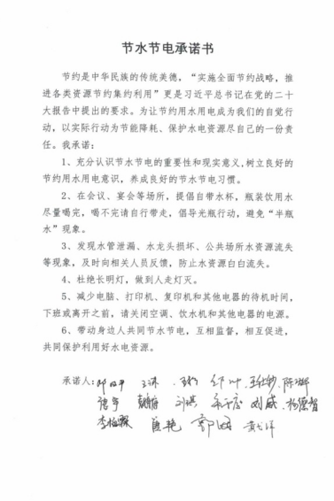 会上,青年理论学习小组成员还结合各自工作岗位实际,分享了学习《深入学习贯彻习近平关于治水的重要论述》的心得体会,并就生活中的节水节电小妙招进行了分享,大家一致表示,要从自身做起,增强节水节电、防灾救灾意识,提升风险防范能力,并现场进行节水节电宣誓、签订《节水节电承诺书》。