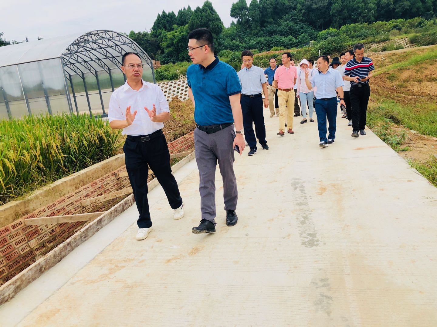 调研组在人民渠二处灌区进水口、五七期干渠水文站、四十二工段,调研人民渠灌区的建设历程、水资源管理、计量用水及灌区受益情况,通过查看供水台账、闸控运行记录,了解基层管水情况;在五七期干渠45支渠水稻典型田块通过询问试验观测员栽秧周期、灌水过程、观测方法及用水记录等,调研灌溉水有效利用系数实测过程;在灌溉试验站,调研组听取了试验站的前期规划,建设过程及后期拟开展的相关试验;在都江堰灌区现代化建设罗江示范区,调研新型一体化闸门,管道输水、高效节水灌溉等设施设备,并参观了综合管理云平台。