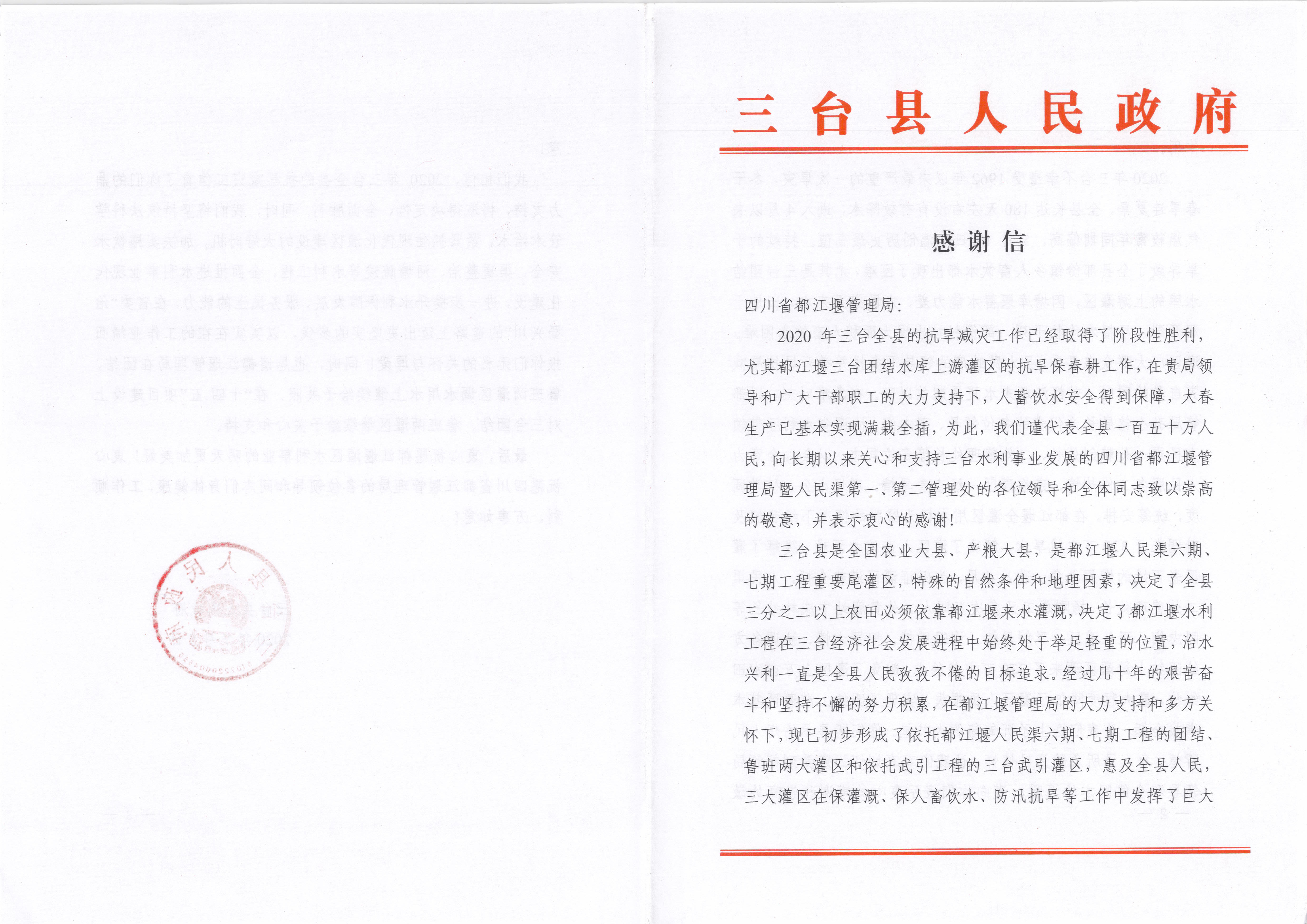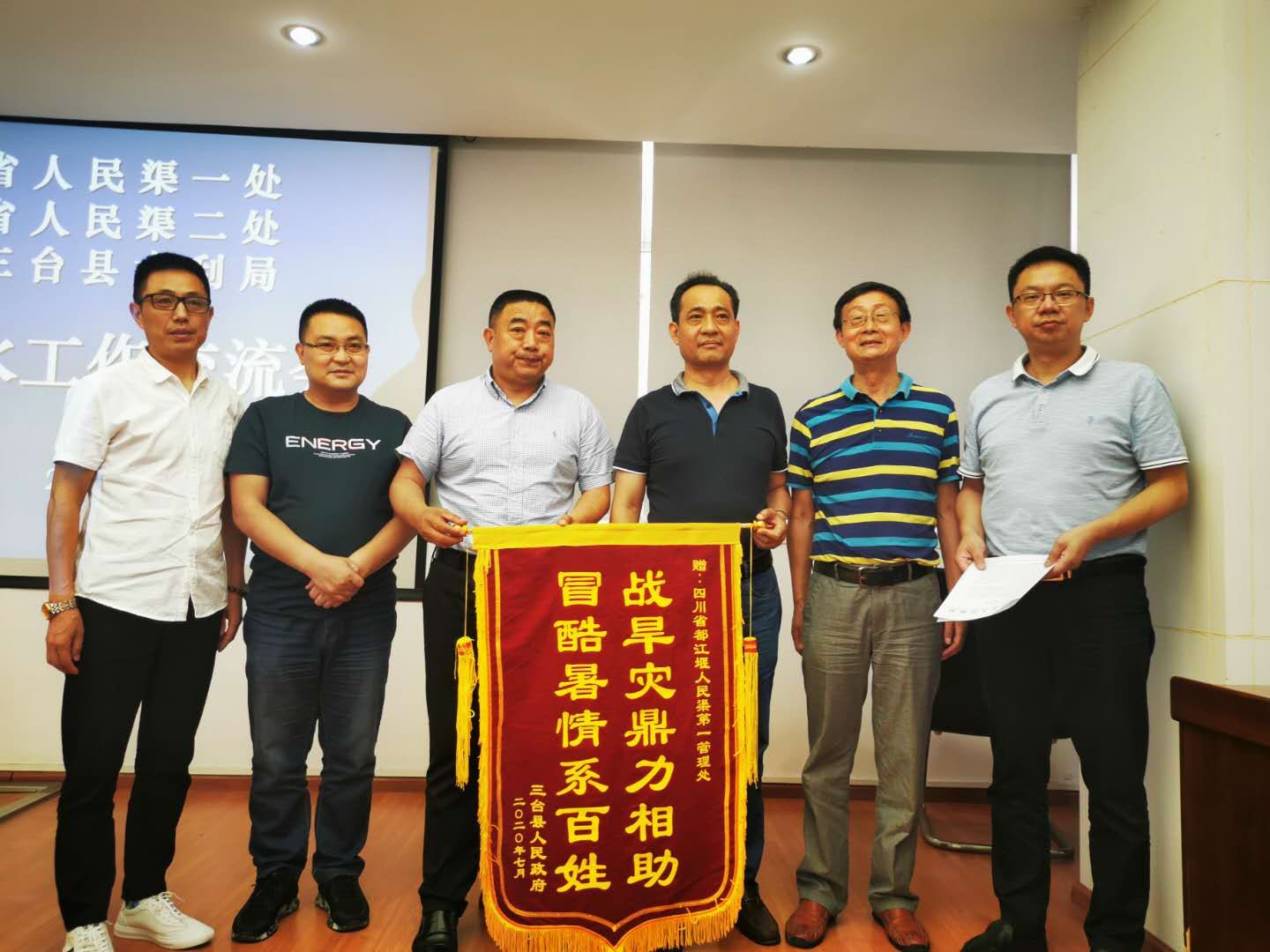 下午,三台县水利局一行在杨刚和供水科工作人员的陪同下到人民渠一处、都江堰管理局分别送上锦旗和感谢信,饮水思源,由衷的表达对都江堰灌区统筹兼顾、鼎力相助的感谢之情。