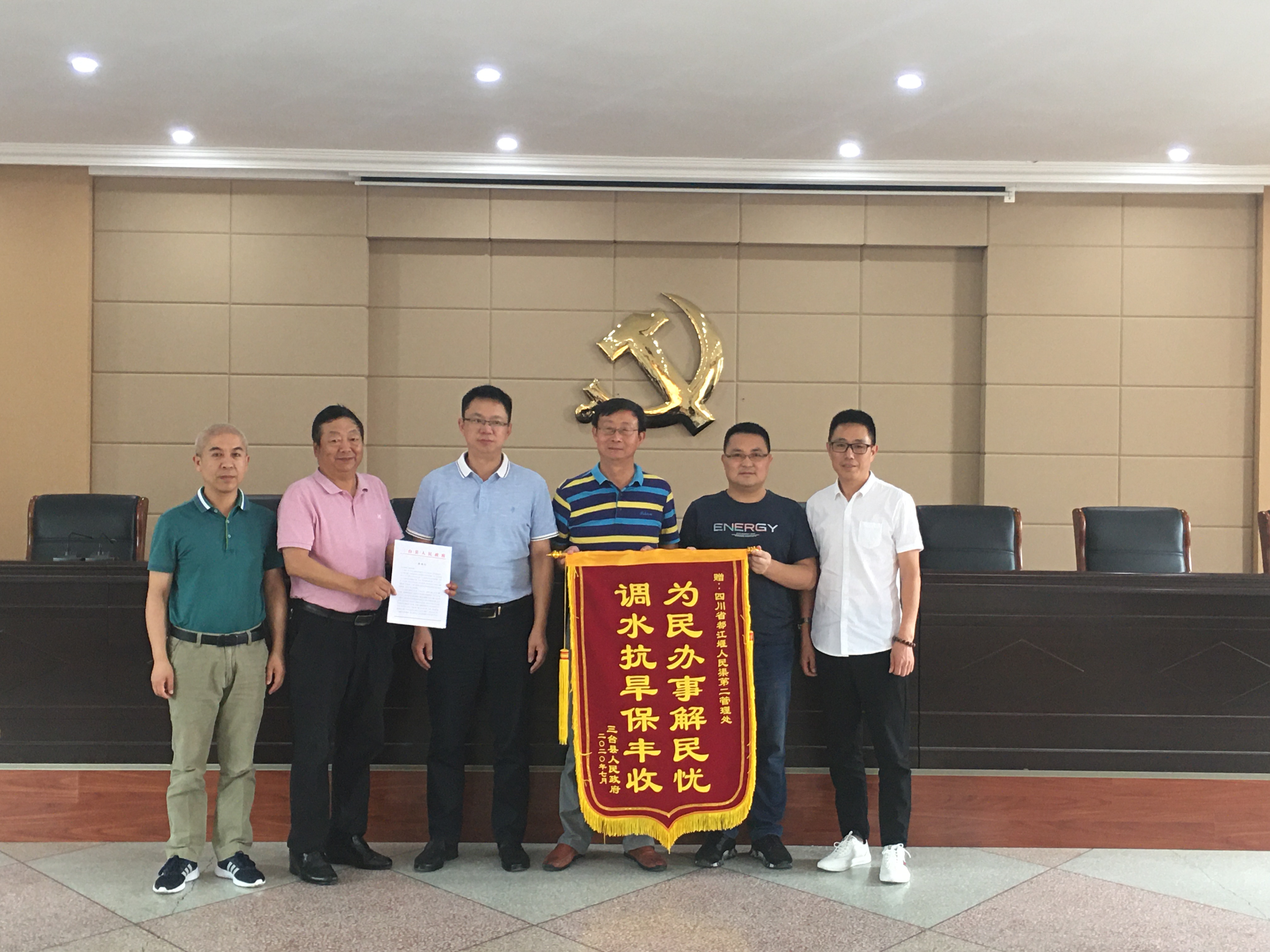 人民渠二处杨刚总工程师代表人民渠二处接收锦旗,杨刚表示,虽然三台县处于人民渠六期、七期尾水灌区,但是在春灌抗旱期间,人民渠二处本着“一个都不能少”的原则,树立全灌区一盘棋的意识,统筹上下游,兼顾左右岸,及时上报旱情、积极争取水源,采取多种措施,协调各方做到了全灌区和谐用水、均衡受益,取得了春灌抗旱工作的阶段性胜利。三台县人民遭受了严重的旱灾,在如此艰难情况下依然遵守调水指令、维护用水秩序,人民渠二处向一直理解、支持调水工作的灌区人民表示感谢。人民渠二处要将三台县人民浓浓情谊传递到每一位职工,鼓舞全体职工继续服务好灌区,全心全意做好接下来的掺灌、蓄水工作,以优质的服务回报灌区人民对人民渠二处的信赖。