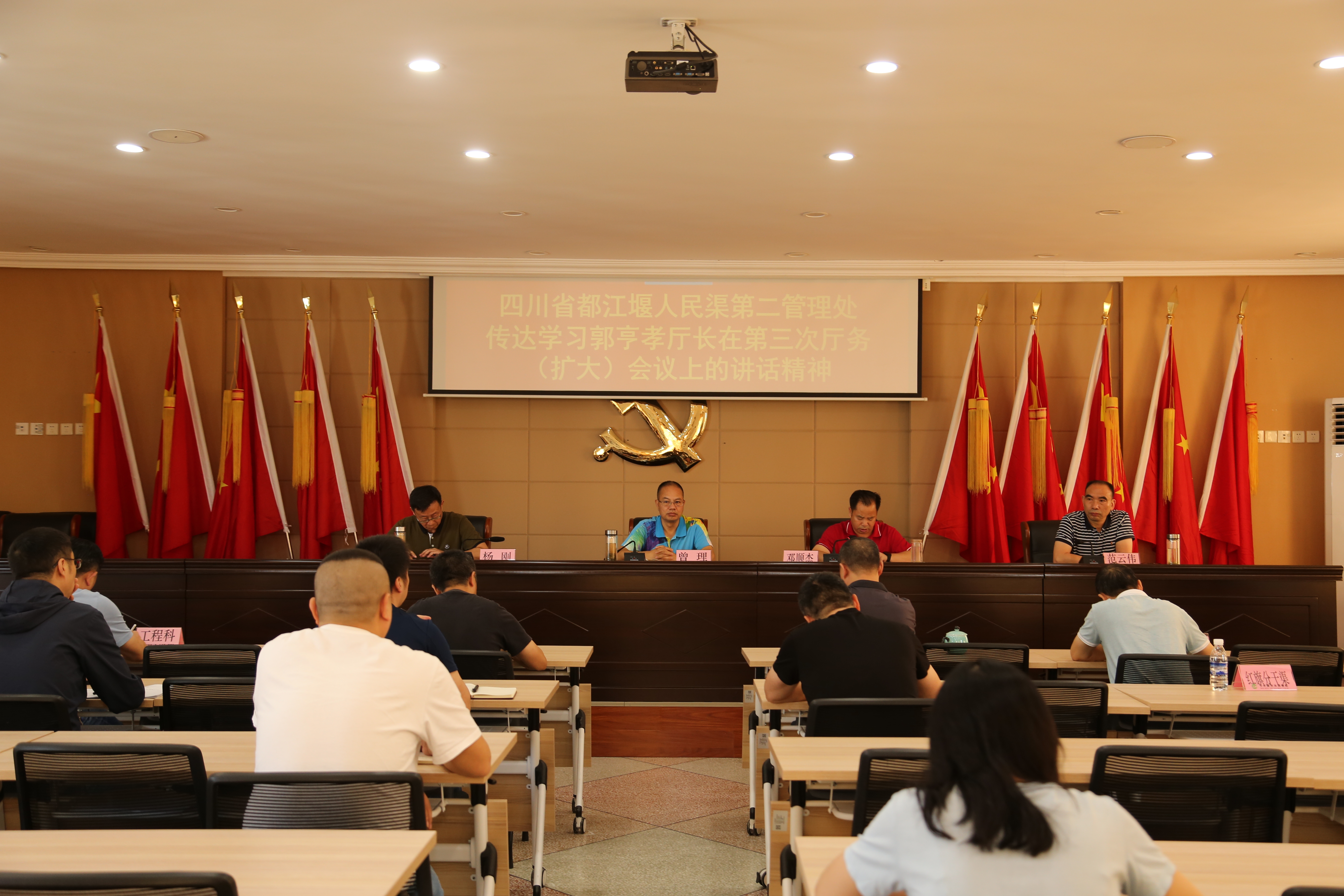 曾理指出,人民渠第二管理处干部职工要以郭厅长讲话精神为指导,认真抓好以下几项工作:一是推动人民渠第二管理处“十四五”规划落实,为单位发展谋好篇、布好局;二是主动作为,积极对接都发中心,推进都江堰灌区三年行动方案顺利实施;三是转变思想,全力支持都江堰灌区一体化改革,主动顺应适应一体化改革,在都江堰一体化改革中主动担当作为;四是以党史学习教育为抓手,强化作风整顿成果,真抓实干,为都江堰灌区发展壮大献策出力;五是对标“3226”总体工作思路,对表“十项要求”考核细则,细化任务分工,压实工作责任,强化绩效考核,在单位内部形成“比学赶超”向上氛围;六是落实好全省水利宣传工作会议精神,加强人员引进和在职职工写作能力培养,不断提升我处水利宣传水平。