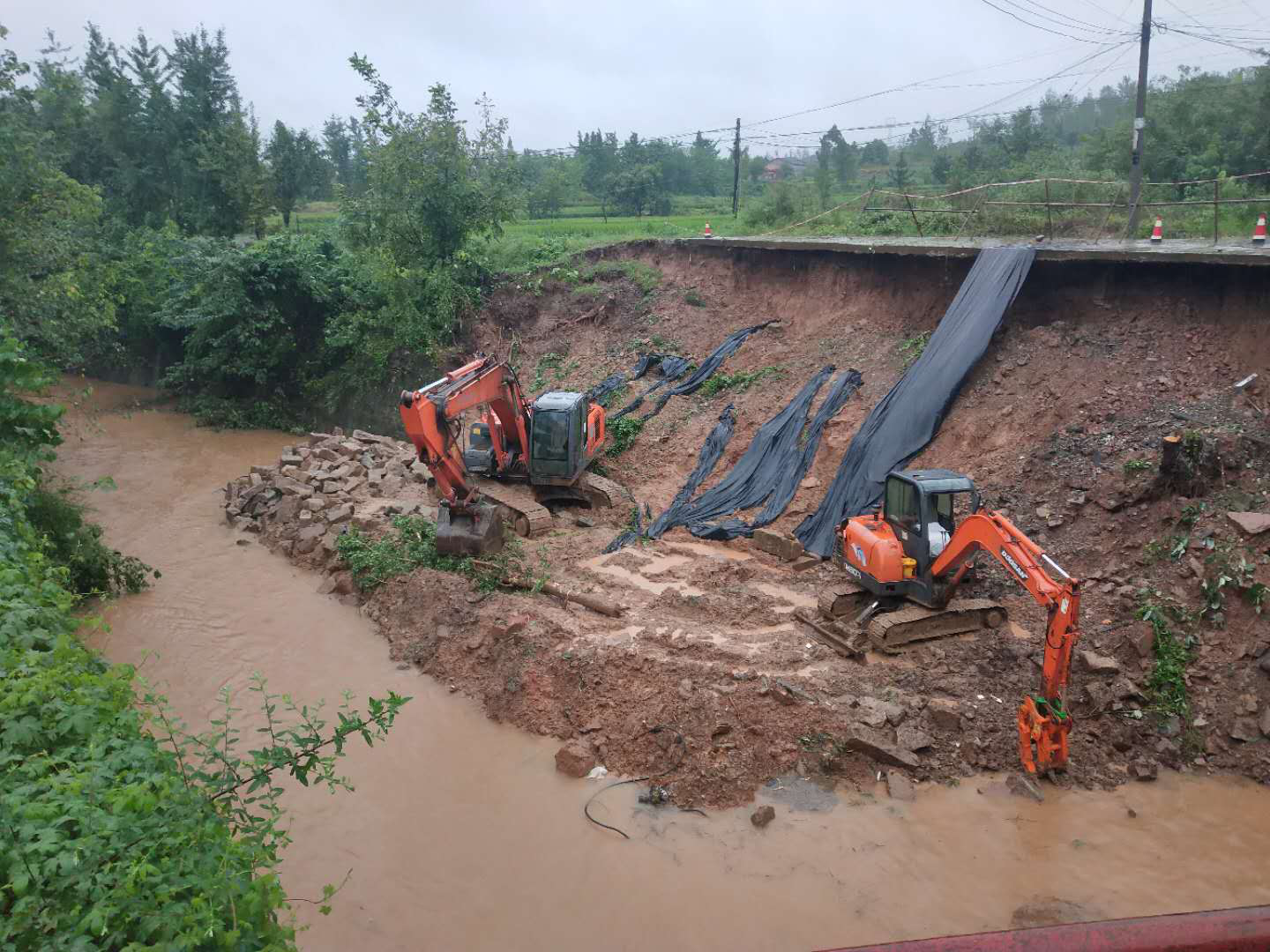 人民渠六期干渠沿线河流洪峰来势汹汹:秀水河河水猛涨,洪水绕过进水闸进入渠道;干河子洪水入渠,渠道多处翻水,六期干渠27+300处垮塌严重。人民渠七期干渠沿线多段爆发山洪,纷纷进入渠道,渠道水位迅速抬升,七期干渠17+260处边坡垮塌、87+200处发生严重塌方。塌方阻塞渠道,形成堰塞体,防汛现场指挥小组第一时间联系当地政府紧急转移附近群众。鲁班水库及时加强巡查,迅速抢险鲁联干渠25+200塌方。