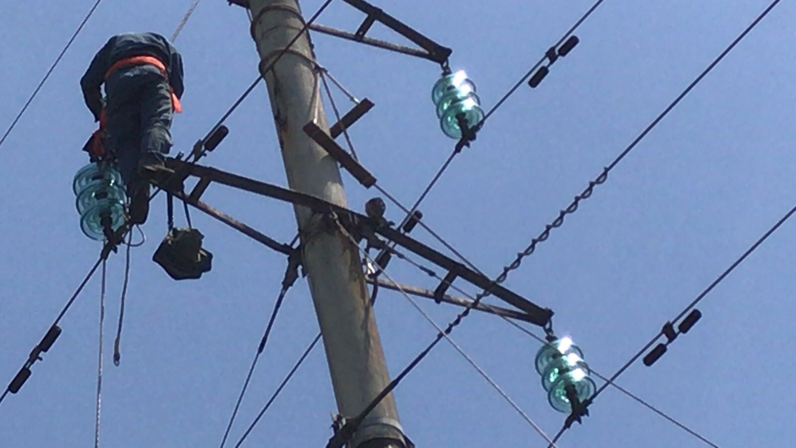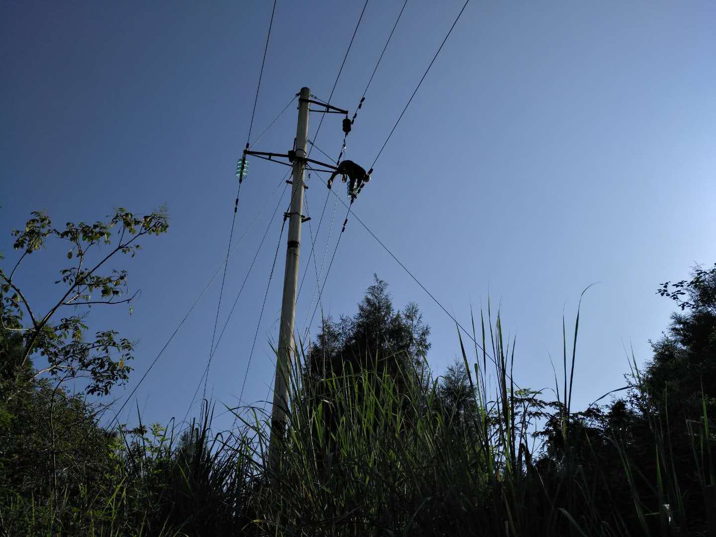 红旗电站银河车间上网输电35KV中银线从1990年建成投入运行至今30余年,电站按照电力规程对该线路杆塔进行维护,线路运行正常。今年8月以来,35kV中银线,几次遭受强暴雨与雷电天气,线路频繁出现跳闸故障,严重影响线路无法安全运行,电站经过组织技术人员对整条线路进行了巡视、排查,并登杆对杆塔绝缘子进行了监测和线路绝缘电阻的测试,研判为线路老化、部分绝缘子有裂伤等多方面因素导致绝缘电阻不能满足安全运行需要,决定利用当前停水有利时机,全线更换绝缘子和登杆安全隐患排查。