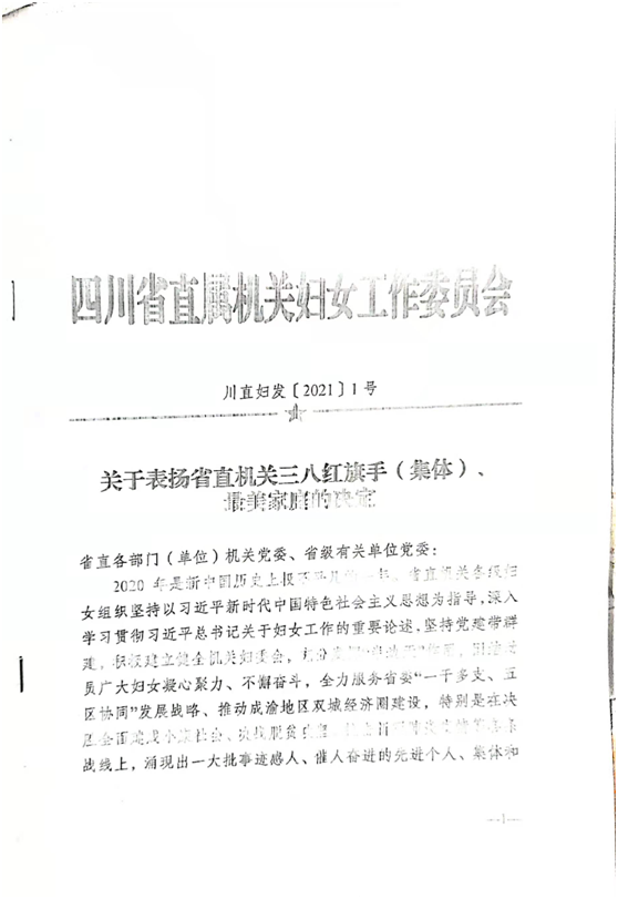 今年三月,四川省直属机关妇女工作委员会发布“关于表扬省直机关三八红旗手(集体)、最美家庭的决定”的表彰文件,金山管理站女职工胡琼荣获“省直机关三八红旗手”荣誉称号。