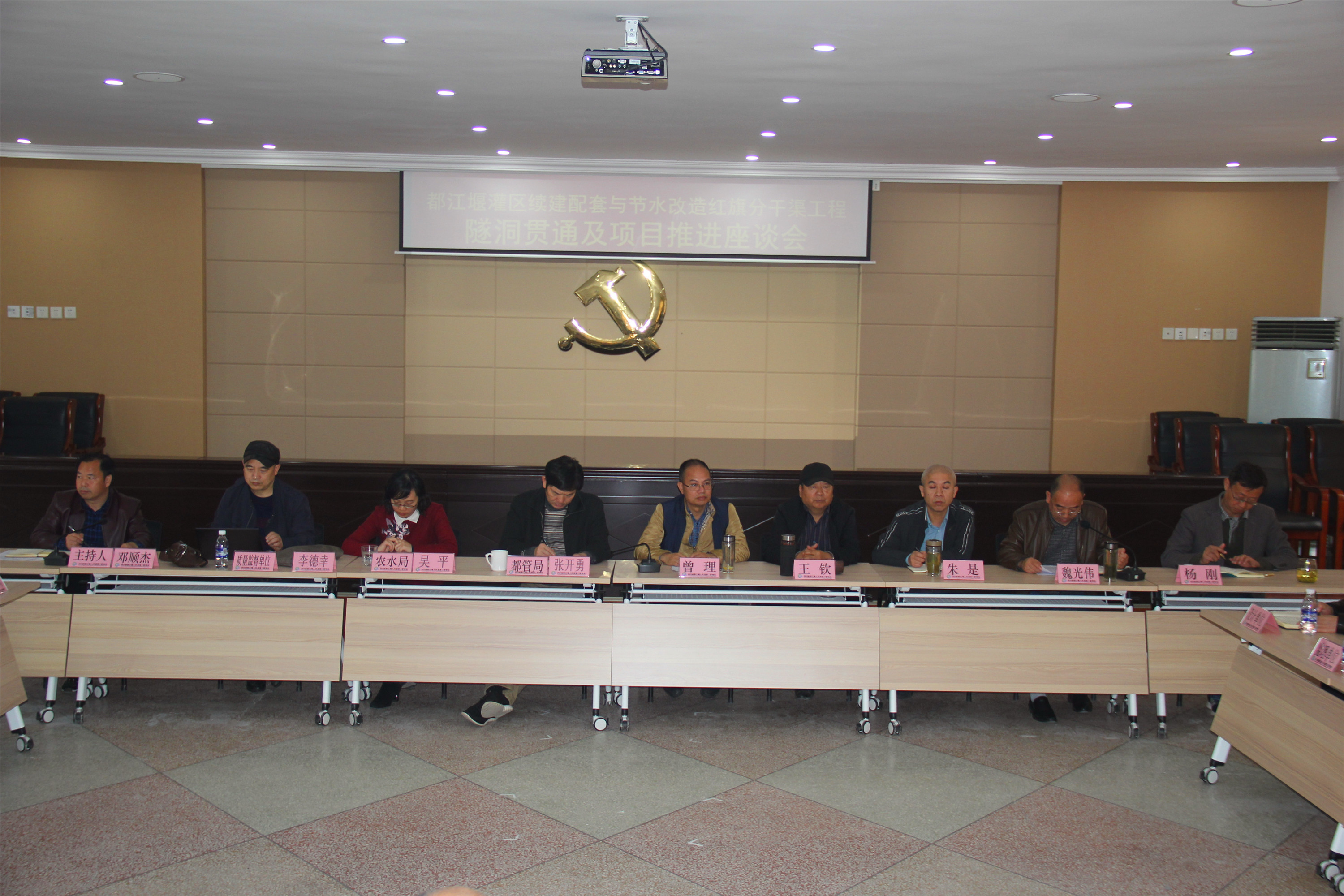 为总结施工经验,安排部署下一步工作,2020年11月11日下午3点,红旗分干渠工程隧洞贯通及项目推进座谈会在管理处6楼会议室召开,都江堰管理局总工程师张开勇、农水局灌区处副处长吴平,都江堰灌区质量监督站、金堂县水务局、中江县水利局代表与在家处领导、部分职能科室主要负责人、中江管理站及参建各方代表40余人参加了会议。会议由人民渠二处工会主席邓顺杰主持。