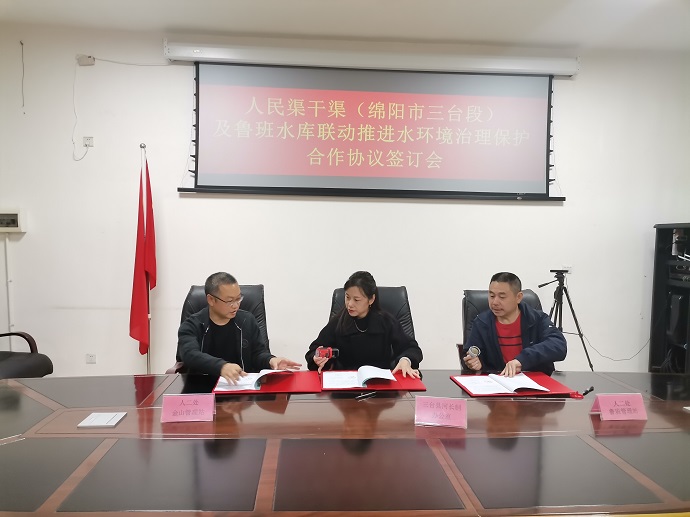 为贯彻落实中央和省市全面推行河长制决策部署,加强四川省都江堰人民渠第二管理处与三台县工作,充分落实《四川省河长制办公室关于在都江堰灌区开展河长与灌区管理单位互访活动的通知》要求,营造流域协同发展的良好氛围,2020年11月18日人民渠二处鲁班管理站、金山管理站与三台县河湖保护中心共同签订在鲁班水库管理中心《联动推进人民渠干渠(绵阳市三台段)水环境治理保护合作协议》。