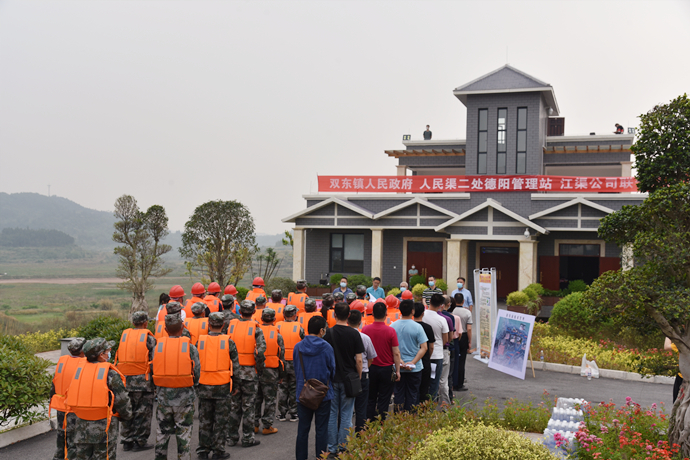 演练前,德阳管理站防汛领导小组对应急演练流程和目的作简要说明,要求快速、有效的处置在德阳管理站管辖范围干渠发生的洪水及重大灾害事故。双东镇宋新书记作了简短的动员,朱是副处长宣布防汛演练正式开始,拉开了此次演练的序幕。演练模拟从星火工段区域正下大暴雨,渠道水位已超过防汛限制水位、雷击造成星火电站甩负荷、双东境内人民渠五七渠干渠48+730处出现了高边坡危岩垮塌及外坡滑坡险情,及时处理事故现场和疏散转移受威胁范围内村民四个方面开展。
