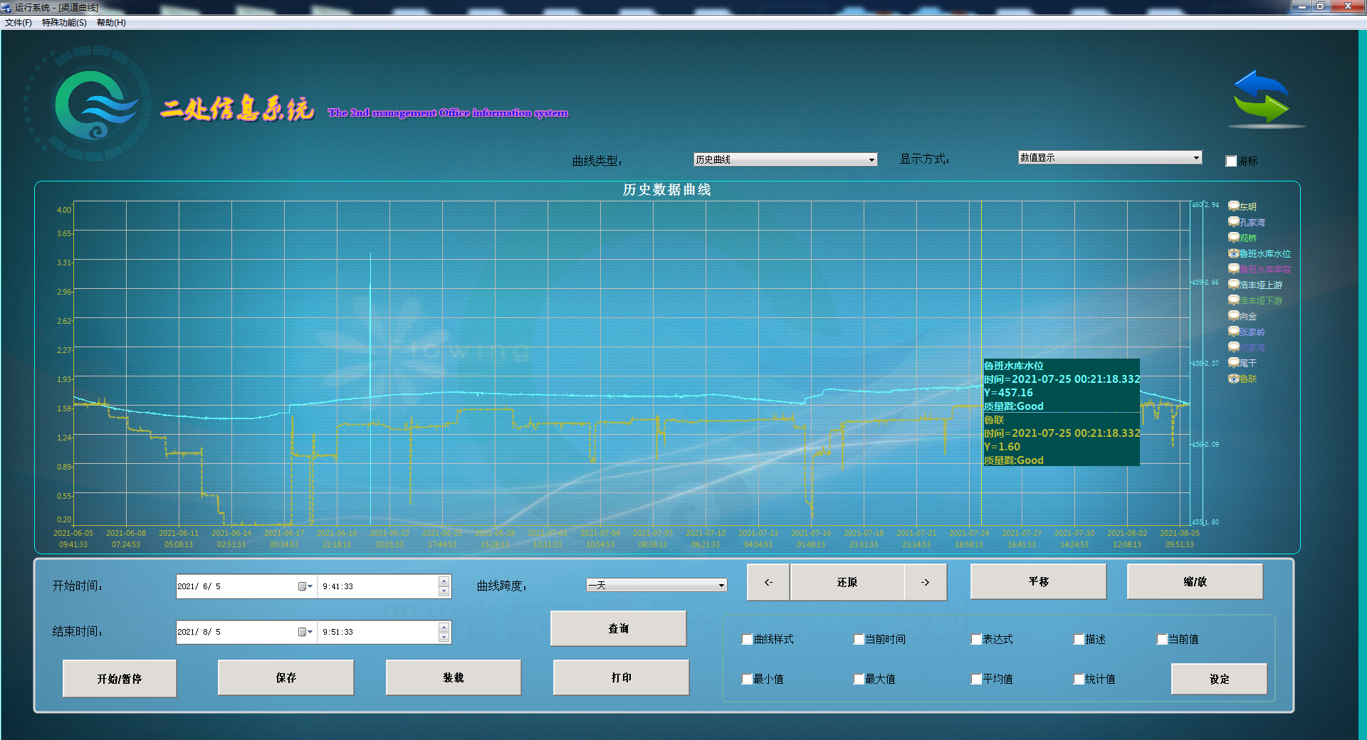 系统能够向用户提供实时数据流程图、历史数据、实时及历史趋势曲线等数据,以每分钟为间隔时间记录一次采集数据,能够方便的按条件进行数据查询,便于技术人员分析、处理。并提供标准SQL数据库,用于与其它系统对接。系统建成以来,运行稳定,功能不断完善。