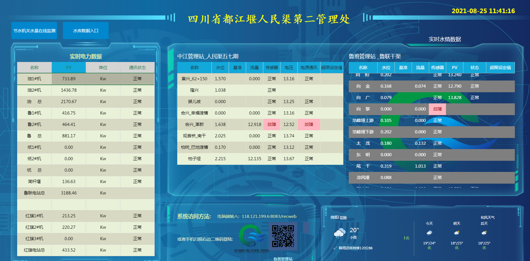 在人民渠二处大力关心和支持下,鲁班管理站于2020年8月顺利完成系统建设。系统通过分散部署在渠道上的数字采集设备,采集渠道实时水位数据,对有流量关系的断面,对应水位换算成相应流量。使管理人员能够在任意一台有网络的计算机上运行渠道参数采集系统,实时掌握渠道运行情况,减少管理人员工作压力。为方便用户访问,系统目前已提供手机web访问功能。