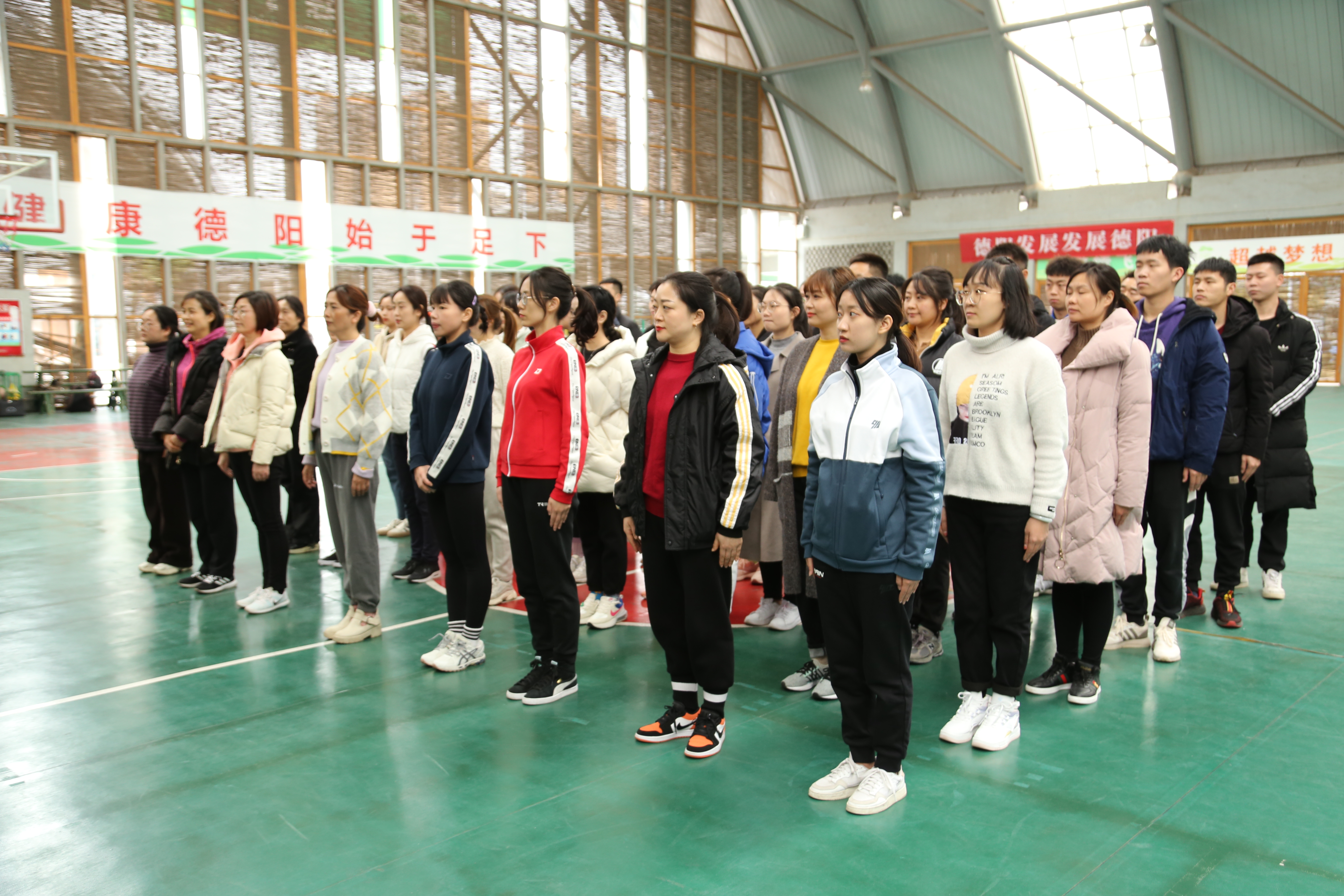 此次集训抽调了东风渠管理处、外江管理处、人民渠一处、人民渠二处共48名职工,集合都发中心四个管理处的骨干力量,计划于17日至22日进行为期6天的封闭式训练,全力做好省直机关第五届职工运动会第九套广播体操的参赛准备工作。刚进入集训第一天,全体参赛队员就迅速进入状态,在练习场上发扬艰苦奋斗、勇于拼搏的精神,以饱满的情绪、坚决的执行力一遍又一遍按教练指令完成动作,在较短的训练时间里,建立起了团队交流合作、协作共进意识。 检查组充分肯定了当前的集训成果,来自各管理处的队员克服了业务工作任务重、天气寒冷等困难,在训练中展现出团结互助、拼搏向上的精神面貌,为此次集训开了好头。同时,检查组也对接下来的训练和参赛工作提出要求:一是要展形象。今年是都发中心成立的第一年,代表水利厅参加此次比赛,是厅党组对都发中心的信任,也是一种肯定,全体队员要以此为前进的动力,认真参加训练、全身心投入比赛,在省直机关系统中充分展现水利人追求卓越、做到极致的精气神。二是要守纪律。全体队员要严格执行训练计划、遵守训练时间,不缺席、不懒散、不松懈,严格纪律要求,保证每一次、每一天的训练效果。三是要强保障。人民渠二处作为集训的具体承办单位,要做好训练和比赛的后勤保障工作,密切关注队员的身体状况和训练状态,让教练和队员能全心全意的、无后顾之忧地投入到训练中去,以最好的精神状态创比赛佳绩,形成心往一处想、劲往一处使的良好氛围。