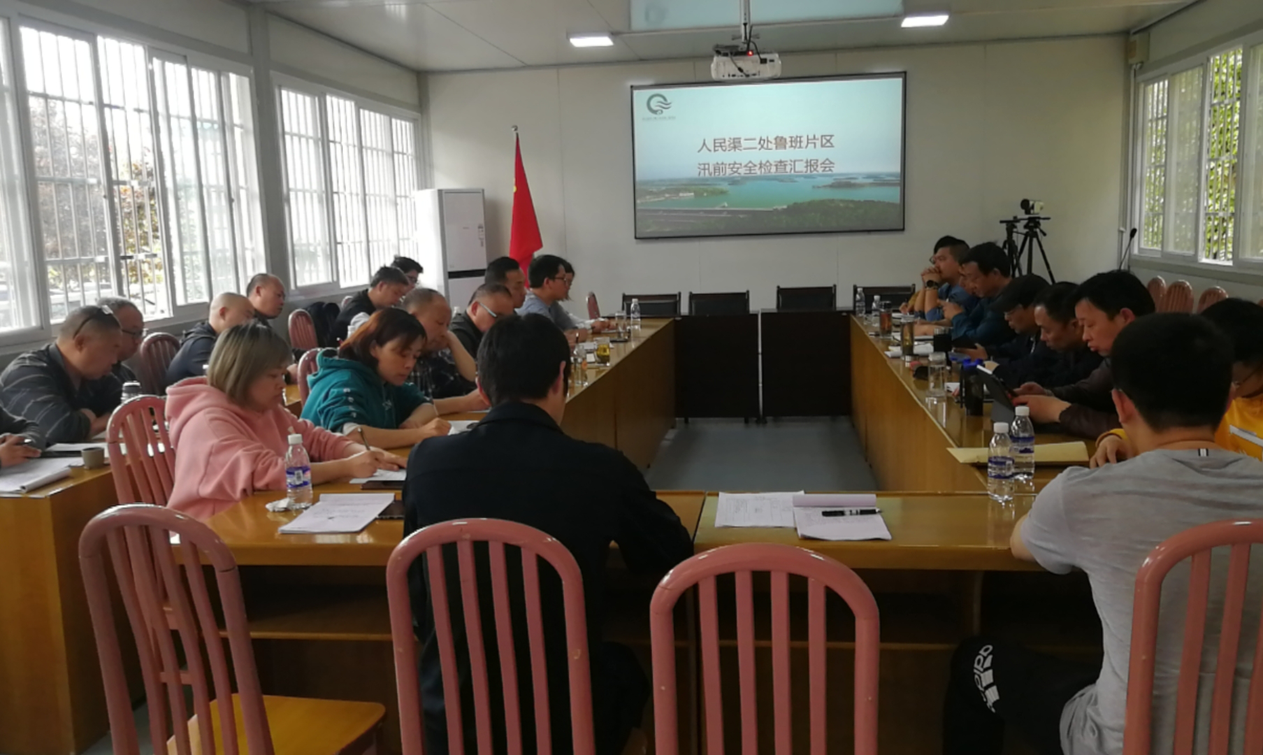 下午,检查组在鲁班管理站会议室召开座谈会。会上,站长陈喜针对我站渠道、水库、泄洪通道、防汛预案以及下一步工作计划等内容进行了汇报。副主任工程师郑海补充了我站管辖范围内,人民渠七期干渠末端三公里左右渠道在发生险情后的处理流程。