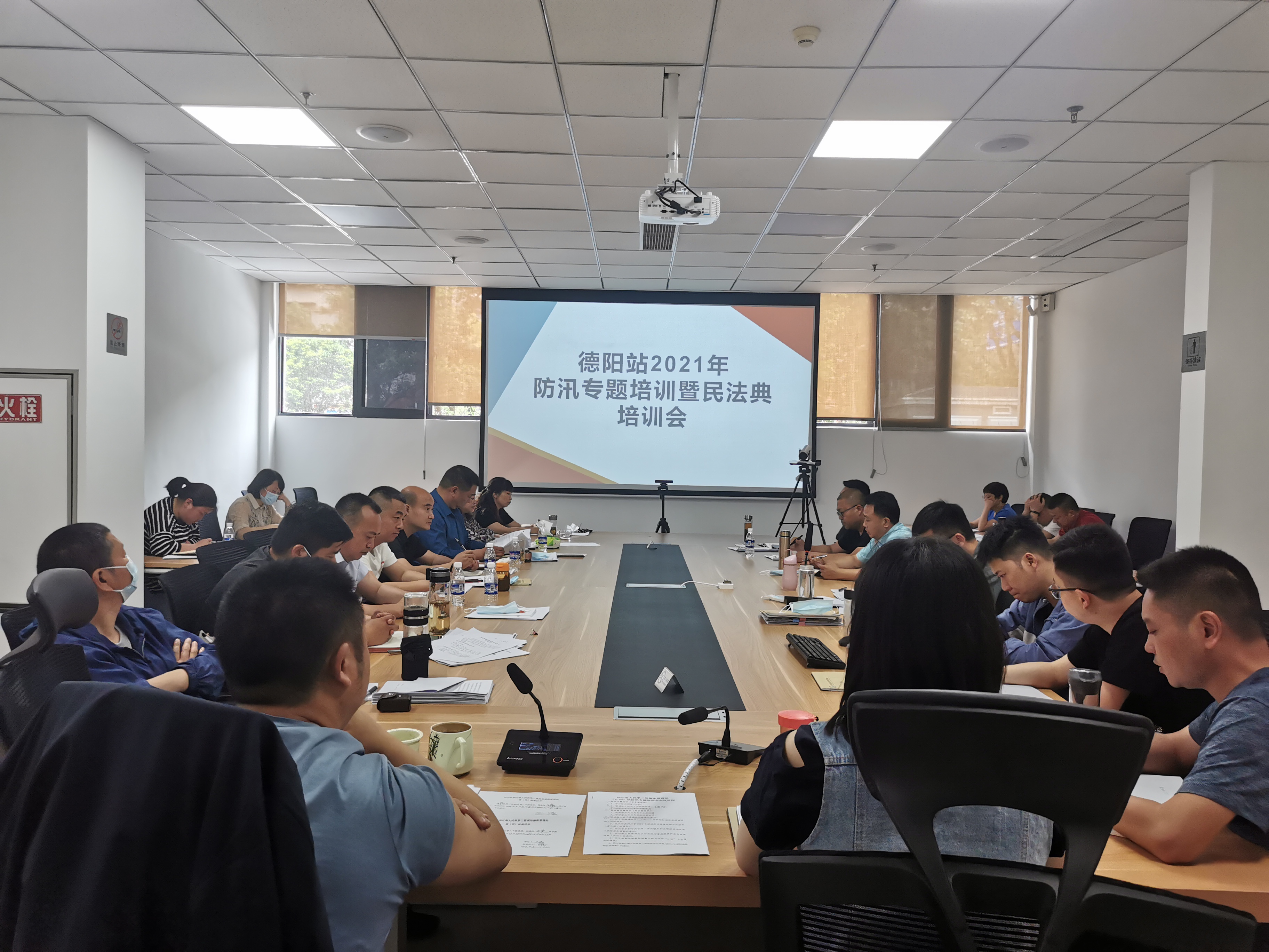在雨季来临之际,为更加有效的应对暴雨侵袭,让职工熟练掌握站防汛预案,提高职工防汛业务能力,5月12日,德阳站开展了防汛专题培训会暨民法典培训会,全站职工参会,副站长王鑫主持培训。