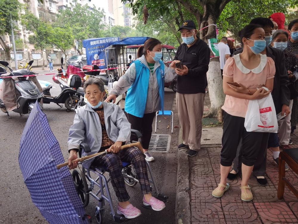 从下午4:30时到晚上9:00时,嗓子显然已经有些沙哑,志愿者们依然积极主动热情地协助群众扫码、亮码、信息登记,不断重复提醒前来排队等待核酸采样的居民,搀扶行动不便的老人参检,耐心为居民答疑解惑。