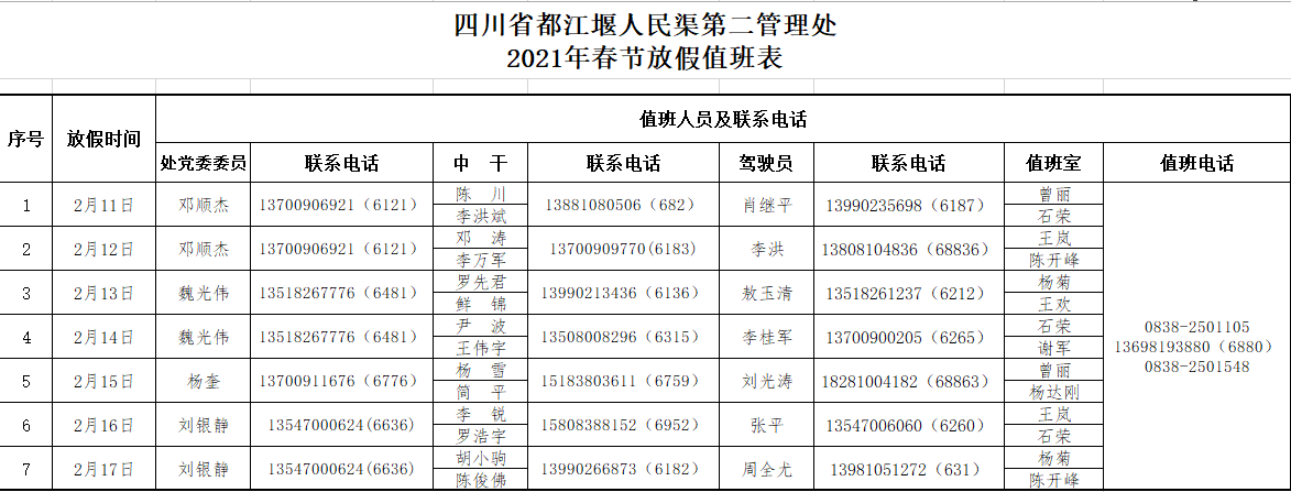 (一)按照上级有关要求,始终保持新冠疫情防控高压态势,全体职工严格执行《四川省都江堰人民渠第二管理处关于做好2021年春运期间疫情防控工作的通知》等文件和通知要求,落实出省报批制度,节日期间不聚餐、不聚会、不扎堆,保障身体健康。